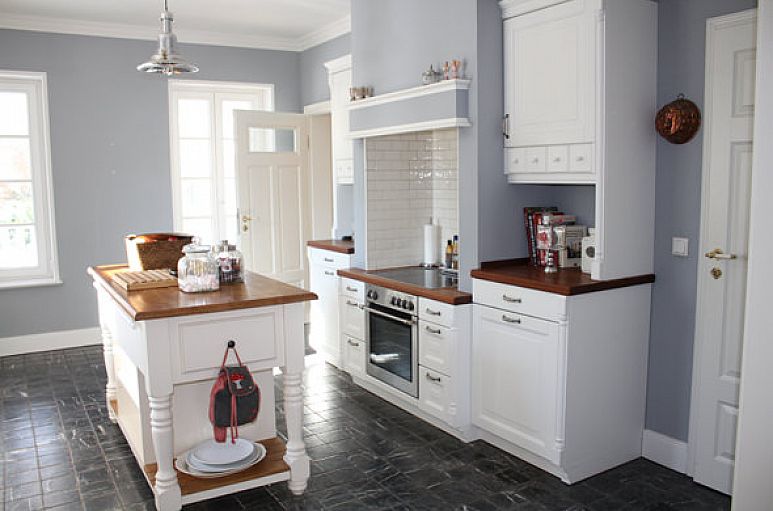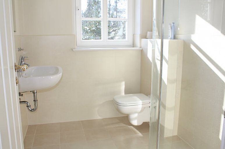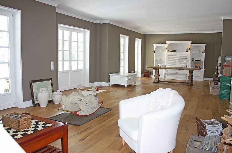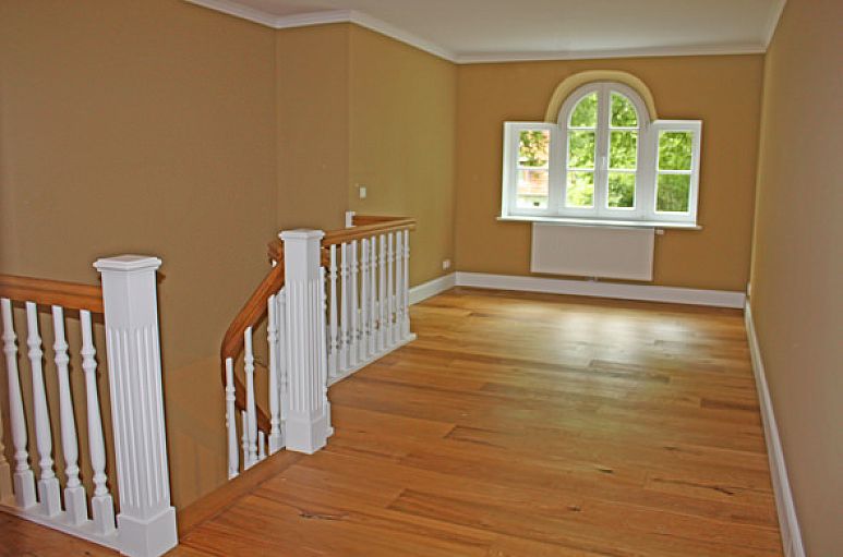 Eine großzügige Villa mit sehr viel Charme und Atmosphäre. Reizvolle Blick- und Lichtachsen prägen in Verbindung mit den Holzböden, hohen Decken und lichtdurchfluteten Verandenflächen einen ganz besonderen Charakter. Deckenhöhen im Erdgeschoss 2,75 m mit Stuckleisten. Eichenholz Landhausdielen, gealtert, gebürstet und geölt in allen Wohn - und Schlafräumen des Hauses. Für die Malerarbeiten im Inneren des Hauses wurden Flamant - Farben verwendet. Die großzügige Eingangshalle mit eindrucksvoller Holztreppenanlage findet Ihre Fortsetzung in der Diele im Obergeschoss. Zweiflügeliger Übergang in den breiten Wohn- / Essbereich mit herrlichem Ausblick über die Veranda in den Garten. Der Wohn- / Essbereich und die Küche gehen auf etwa 80 m² großzügig ineinander über. Wohnküche mit zweiflügeligem Übergang in den Wohn- / Essbereich, Marmor - Fußboden „Nero Marquina“, Speisekammer. Hochwertige Landhausküche mit stilvollen Einbauten mit weiß patinierten Fronten und Stil - Beschlägen, massiven Teakholz Arbeitsflächen, klassischer Landhaus- Esse, Spülstein von Villeroy & Boch mit Stil-Armatur. Freistehende Kühl - / Gefrierkombination im Retro - Design. Ein separates Zimmer im Erdgeschoss. Fußbodenheizung im Erdgeschoss und in den 3 Bädern des Obergeschosses. Hochwertige, weiß lackierte Innentüren und Türzargen mit Profilierungen und passenden Drückergarnituren. Die zweiflügeligen Innentüren und die Hauseingangstür verfügen zusätzlich über Glaseinsätze mit Facettenschliff. Weiß lackierte Sprossenfenster und - türen in Vollholz mit 3-fach Verglasung. Im Obergeschoss die großzügige Diele, vier reelle Zimmer mit reizvollem Ausblick ins Grüne, 3 Bäder sowie der Hauswirtschaftsraum. Hauptschlafzimmer mit Bad en Suite. Dieses Bad und das Gäste - WC sind mit Objekten der englischen Marke „Traditional Bathrooms“ und exklusiven Zementfliesen im klassischen Stil von VIA ausgestattet. Zusätzlich zwei Duschbäder in Sandstein - Farbtönen mit bodengleichen Glasduschen, weißen Duravit Objekten und Regenduschen. Hauswirtschaftsraum mit Anschluss für Waschmaschine und Trockner. Im hinteren Gartenbereich das große Garagenhaus mit Stellplatz für 2 PKW und separaten Geräteraum. Computer - und Medienverkabelung. Zentraler Wasserenthärter.