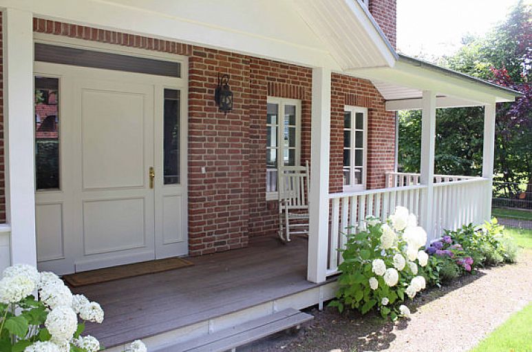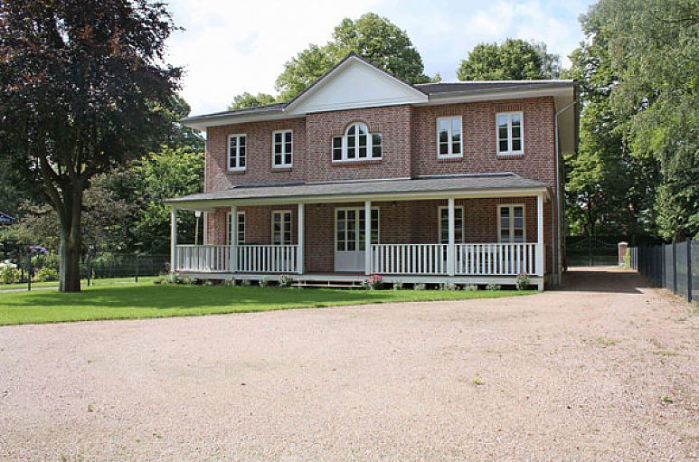 Die Rotklinkervilla wurde 2010 in Massivbauweise erbaut. Überdachte Veranden mit Holzböden befinden sich vor und hinter dem Haus.
