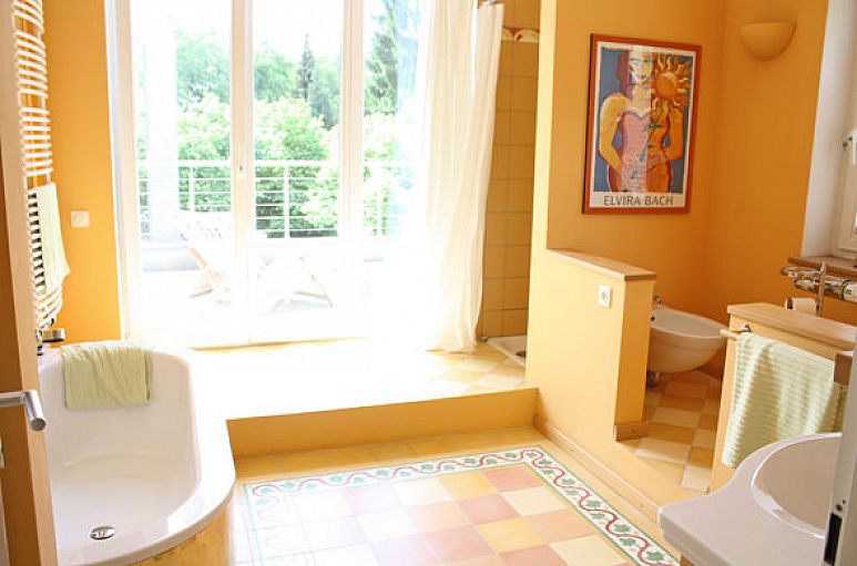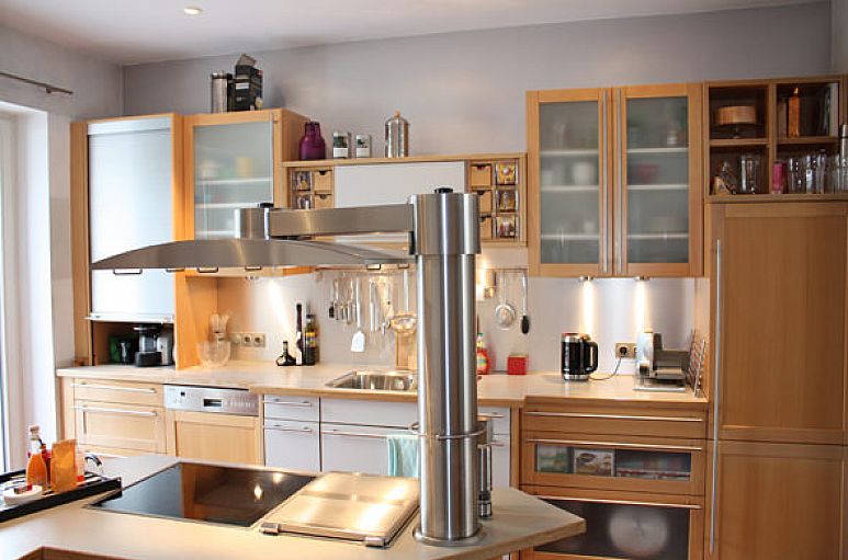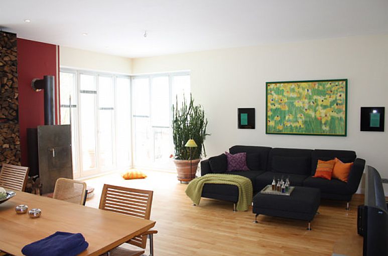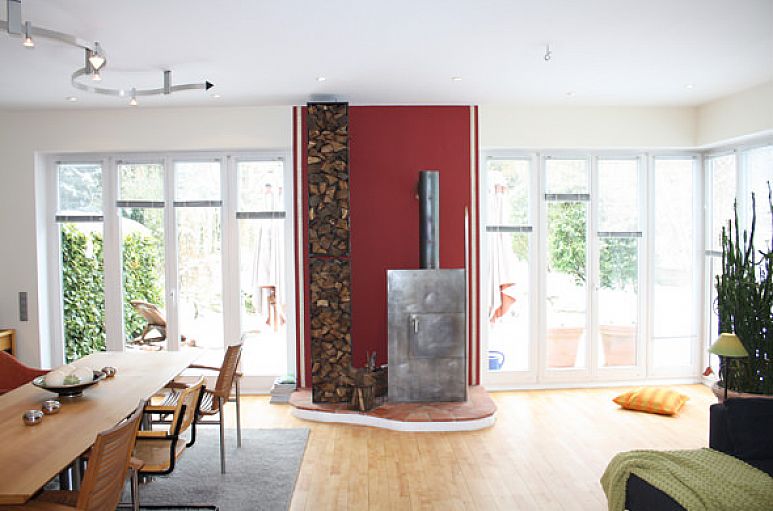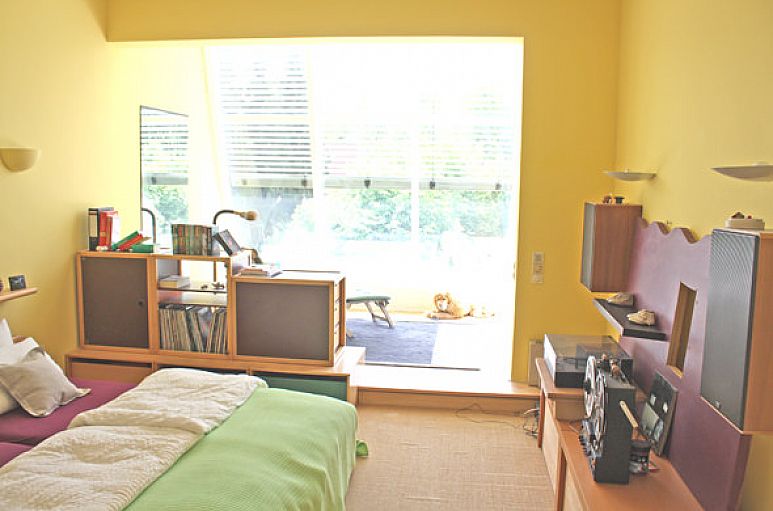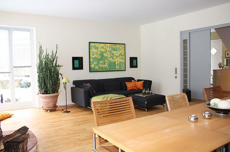 Das Haus wurde mit Kalksandsteinmauerwerk und weiß lackierten Holzfenstern erbaut. Im gesamten Haus wurden zahlreiche Downlights eingebaut. Die Verkabelung für eine Alarmanlage ist vorhanden. Der Eingangsbereich mit handgearbeiteten Zementfliesen und reizvoller Treppenanlage mit Einbauleuchten öffnet sich durch eine zweiflügelige Türanlage zum Wohn- / Essbereich mit 2,90 m Deckenhöhe. Wohn- / Essbereich mit 22 mm Massiv-Parkett aus Buchenholz und Design-Kaminofen. Doppelflügelige Schiebetüranlage zur Küche. Einbauten in Buche und Edelstahl, freistehendes Kochzentrum, Geräte Gaggenau und Siemens, Fußboden Zementfliesen. Im Obergeschoss befinden sich drei Zimmer und ein Bad. Die Endetage beinhaltet den Hauptschlafbereich mit Wintergarten, Dachterrasse, Schrankraum und Bad. Durch die Dachkonstruktion des Pultdaches betragen hier die Deckenhöhen bis zu über 3 m. Aufgrund des bis zum Boden verglasten Wintergartenvorbaues eröffnet sich aus dem Schlafbereich ein herrlicher Ausblick ins Grüne. Wintergarten in Holz- / Metallbauweise. Das Bad ist mit Zementfliesen und hochwertigen Sanitärobjekten ausgestattet. Vom Schlafbereich und aus dem Bad betritt man die intime Dachterrasse. Vollkeller mit ausgebautem Raum, Saunabereich, Duschanlage, Heizungs- und Abstellraum.