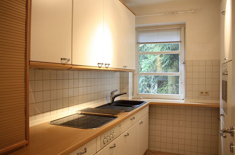 Hochwertig gestaltetes Treppenhaus in weißem Marmor und mit Teppichböden. Heller Wohn- / Essbereich mit Zugang zum Balkon und viel Sonne von Süden und Westen. Weißes Vollbad mit beleuchtetem Spiegel und Schrankeinbauten. Einbauküche in weiß, teilweise Echtholz Buche mit Miele Geräten, Backofen bequem auf halber Höhe. Weiße Holzfenster und Marmorfensterbänke. Einbruchschutz an der Eingangs- / und der Balkontür sowie zahlreiche Plissees. Gefliester Abstell- / Hauswirtschaftsraum mit Waschmaschinenanschluss. Ein drittes Zimmer (etwa 10 m²) wäre mit einfachen Mitteln durch die Zusammenlegung des Essbereiches mit einem Teil des HW-Raumes möglich. Weiterhin gehört zur Wohnung ein Kellerraum und ein Stellplatz in der Tiefgarage.