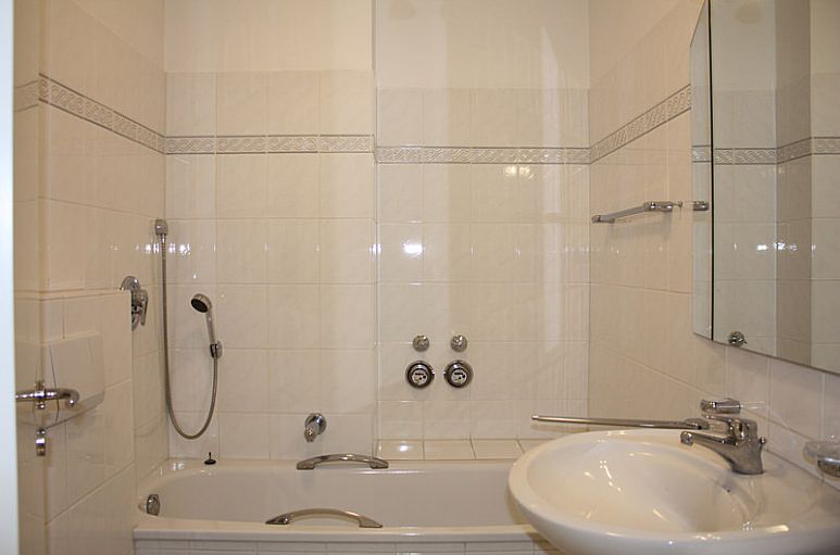 Hochwertig gestaltetes Treppenhaus in weißem Marmor und mit Teppichböden. Heller Wohn- / Essbereich mit Zugang zum Balkon und viel Sonne von Süden und Westen. Weißes Vollbad mit beleuchtetem Spiegel und Schrankeinbauten. Einbauküche in weiß, teilweise Echtholz Buche mit Miele Geräten, Backofen bequem auf halber Höhe. Weiße Holzfenster und Marmorfensterbänke. Einbruchschutz an der Eingangs- / und der Balkontür sowie zahlreiche Plissees. Gefliester Abstell- / Hauswirtschaftsraum mit Waschmaschinenanschluss. Ein drittes Zimmer (etwa 10 m²) wäre mit einfachen Mitteln durch die Zusammenlegung des Essbereiches mit einem Teil des HW-Raumes möglich. Weiterhin gehört zur Wohnung ein Kellerraum und ein Stellplatz in der Tiefgarage.