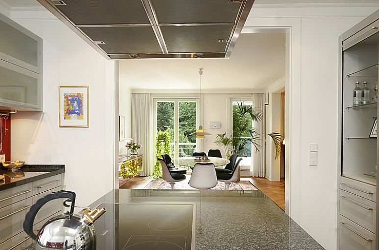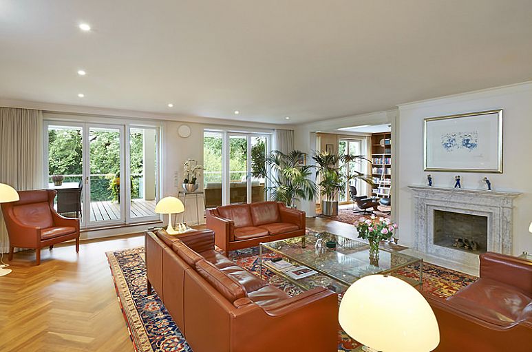 Eingangshalle mit Garderoben - Einbauten, durch eine doppelflügelige Türanlagen mit dem Wohnraum verbunden. Wohnraum, Esszimmer und Bibliothek gehen auf etwa 90 m² offen ineinander über. Im Wohnraum befindet sich ein offener Bio-Ethanol Marmorkamin. In der Bibliothek angefertigte Einbauten. Küche und Esszimmer sind miteinander verbunden. Einbauküche mit weißen Fronten, dunklen Granit – Arbeitsflächen und einem roten Glas - Küchenspiegel. E - Geräte von Miele. Kochinsel mit breitem Induktionsfeld und Edelstahlesse. Großer, doppelflügeliger Kühl- / Gefrierschrank, Ice – Crusher und Edelstahlfronten. Backofen, Mikrowelle, Warmhaltezone. Drei Zimmer sowie drei Bäder. Hauptschlafbereich bestehend aus Schlafzimmer, Schrankraum und Masterbad en Suite. Im Schrankraum befinden sich angefertigte Einbauten. Weitere Schrankeinbauten in den Zimmern. Masterbad mit Marmorbelag, Eckbadewanne und bodengleicher Dusche. Zwei weitere großzügige Zimmer. Ein Duschbad in sandsteinfarbenem Feinsteinzeug gearbeitet, das Dritte in einem Schieferton. Im Hauswirtschaftsraum befinden sich ebenfalls Einbauten. Integrierter Weinkühlschrank. Anschluss für Waschmaschine und Trockner. TV und Internetradio in allen Räumen verfügbar. Soundsystem. Garagenstellplätze für 2 PKW in der Tiefgarage des Hauses. Lift.