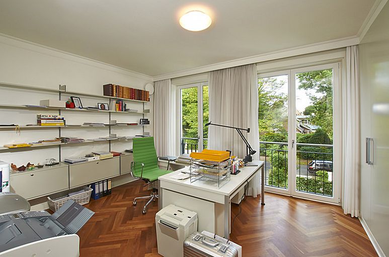 Weiße, bodentiefe Holzfenster mit P4A Sicherheitsverglasungen und Fensterüberwachung durch das Alarmsystem mit Aufschaltung auf eine Alarmzentrale. Zusätzlich elektrisch betrieben Rollläden. Fenster und Türen in der Wohnung mit Futter und Bekleidungen. Hochwertige Innentüren von Brüchert + Kärner. Glatte Wände. Angefertigte Schrank–Einbauten. Kirschholzparkett in klassischer Fischgratverlegung und Hamburger Fußleisten in allen Wohnräumen außer im Hauptschlafzimmer. Fußbodenheizung. Zahlreiche Downlights mit LED-Technik.