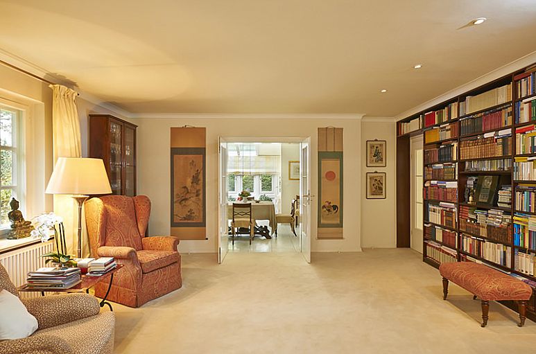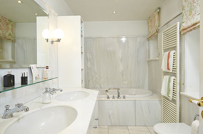 Eingangsbereich mit Glasdach und Holztreppenanlage. Im Wohnraum befindet sich ein Kamin von Leonardo Caminetti, angefertigte Einbauten in der Bibliothek. Die Küche verfügt über Einbauten von Bulthaup / Geräte Gaggenau / Arbeitsflächen anthrazitfarbener Granit. Leicht erhöht zum Garten und sehr geschützt im Winkel des Hauses mit immergrünen Hecken an den offenen Seiten wurde die Terrassenanlage mit Granitpflaster angelegt. Große Markisenanlage. Hauptschlafbereich im Erdgeschoß mit Schrankeinbauten, Bad en Suite (großflächige Marmorplatten, Whirlpool Wanne von Hoesch). Duschbad / Gäste – WC, Windfang, Speisezimmer, Wintergarten und Küche sind ebenfalls mit schlichtem Marmorfußboden ausgestattet. Im Dachgeschoß befinden sich 3 ½ Zimmer und ein Bad. Das Haus ist mit einer Alarmanlage mit Außenhautsicherung ausgestattet, Teile des Erdgeschosses mit Fußbodenheizung. Das Dach wurde 2004 mit Tonpfannen neu gedeckt, die Wärmedämmung erneuert, ebenso die Regenrinnen und Fallrohre in Kupfer.