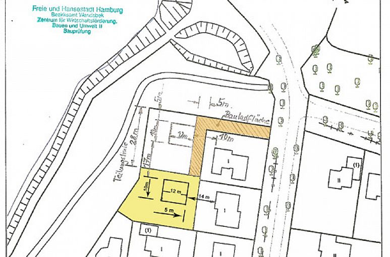 Gemäß Bau-Vorbescheid vom 09.10.2014 des Bezirksamtes Wandsbek, Zentrum für Wirtschaftsförderung, Bauen und Umwelt, der Stadt Hamburg ist folgende Bebauung auf dem Grundstück möglich:
