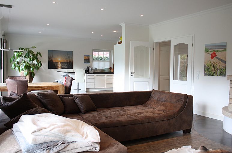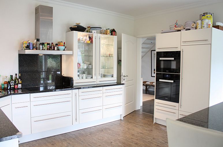 Deckenhöhen im Erdgeschoss 2,70 m. Dimmbare Halogen-Downlights in allen Wohnräumen im Erdgeschoss. Eingangshalle mit weißer Holztreppenanlage und großformatigen Feinsteinzeug-Fliesen. Heller Wohn-/ Essbereich über die gesamte Hausbreite mit Kamin und Ausblick in den Garten. Von hier Ausgang auf die breite Süd-West-Terrasse mit sehr guter Besonnung. Elektrisch betriebene Markise. Zum Wohnbereich offene, weiße Einbauküche mit Granitarbeitsflächen und Kücheninsel. E-Geräte von Miele und Bosch (Mikrowelle, Backofen, großes Ceran-Kochfeld, Geschirrspüler, Kühlschrank, Edelstahlabzugshaube). Fußbodenheizung im gesamten Haus. Elektrische Rollläden vor vielen Fenstern. Wellnessbereich im Erdgeschoss mit großer Sauna und bodentiefer Glasdusche. Hauswirtschaftsraum mit Waschmaschinenanschluß, Abstellflächen und Nebeneingang. Im Dachgeschoss befinden sich zwei großzügige Zimmer mit jeweils etwa 21,5 m², Klimaanlage und Ausgang auf den Balkon mit Süd-West-Ausrichtung. Zwei weitere, sehr reelle Zimmer und ein Vollbad. Die Nebenkosten in Höhe von € 200,00 monatl. trägt der Mieter. Die Verbrauchs-/ Wartungskosten werden direkt durch den Mieter gezahlt.