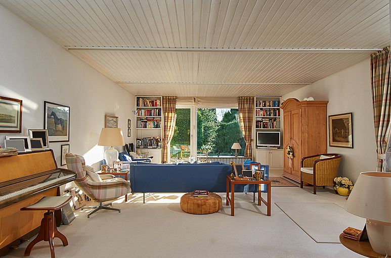 Der großzügige, offen ineinander übergehende Lebensbereich und die intime Gartensituation prägen den besonderen Charakter dieses Hauses.