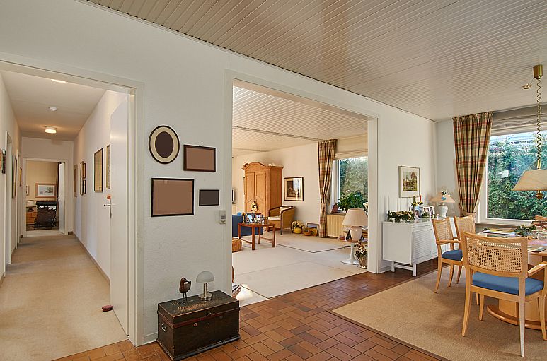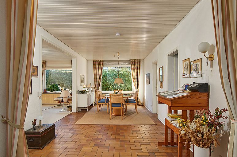 Eingangssituation mit Garderobe, Essdiele und Wohnbereich gehen großzügig ineinander über. Einen herrlichen Platz bietet die Terrasse vor dem Wohnbereich, sehr geschützt gelegen und teilweise überdacht. Viel Sonne von Süden und Westen. Die Küche und ein halbes Zimmer sind von der Essdiele zugänglich. Es ist gut möglich, eine offene Wohnküche zu gestalten. Schlaftrakt mit drei Zimmern und einem Vollbad. Die zwei kleineren Zimmer können zu einem großem Raum zusammengelegt werden. Die Ausstattung von Küche, Vollbad und Gäste-WC entspricht dem Baujahr. Teilkeller mit großem Abstellraum, Hauswirtschafts-, Heizungsraum, Tankraum.