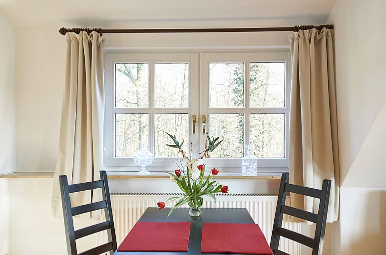 Die Wohnung verfügt über eine sehr gelungene Raumaufteilung mit großzügigem Wohn- / Essbereich und guter Belichtung, einem Zimmer mit etwa 16 m² mit Vollbad en Suite und einem halben Zimmer. Helles Gäste-WC mit Dusche. Abstellraum. Küche mit hellen Einbauten. Von innen sind die Holzsprossenfenster und -türen weiß lackiert. Wohn- / Essbereich und Flur sind mit terrakotta-farbenen Fliesen ausgestattet. Vom Wohn-/ Essbereich und der Küche Ausgang auf die geschützte Süd-Loggia mit reizvollem Blick. Eine Besonderheit ist der große Spitzboden für Abstellzwecke. Die Wohnung befindet sich in einem gepflegten Zustand. Außerordentlich ruhige Wohnlage.