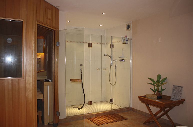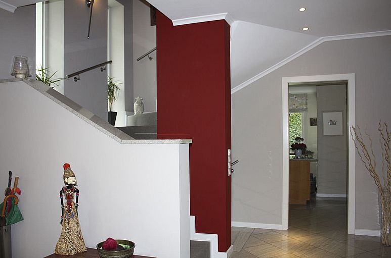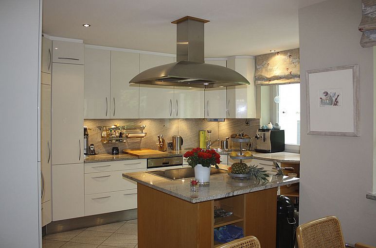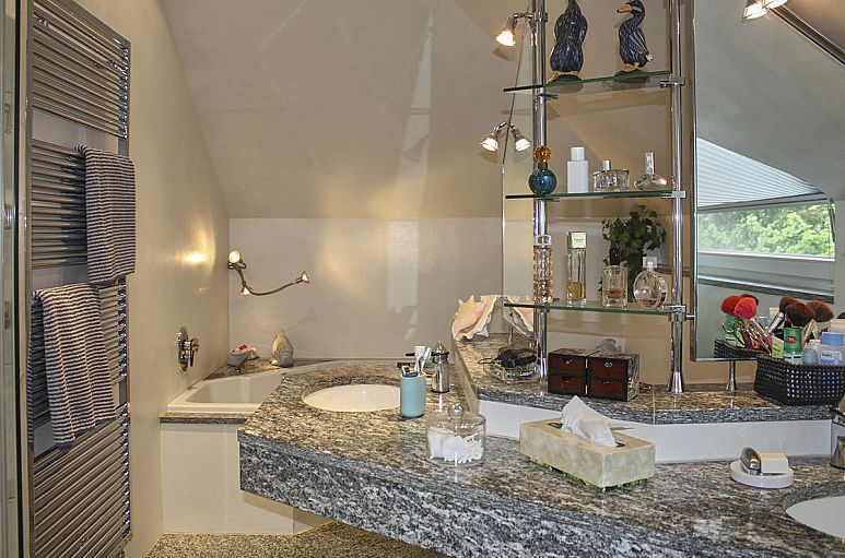 Das Haus befindet sich in einem sehr gepflegten Zustand. Die Eingangshalle öffnet sich zum Wohn- / Essbereich mit Kamin und wunderschönem Blick in den Garten. Davor die Terrassenanlage mit überdachtem Bereich und Markise. Die Fenster mit starker Sonneneinstrahlung im Erdgeschoss werden bei Bedarf mit Fallmarkisen beschattet. Die großzügige Wohnküche mit Tür in den Garten verfügt über ein freistehendes Kochzentrum, französische Einbauten, angefertigte Elemente, Granit-Arbeitsflächen und Platz für einen Esstisch. Weiterhin befindet sich im Erdgeschoss ein separates Zimmer, das auch mit dem Wohn- / Essbereich verbunden werden kann. Eingangshalle, Küche und Gäste-WC verfügen über hellen Granitfußboden, im Wohn- / Essbereich Eichendielen-Fußboden. Im Obergeschoss befindet sich der Haupt- Schlafbereich mit eigenem Flur, großzügigem Granitbad mit Eckwanne und Glasdusche und dem Schlafzimmer mit begehbarem Schrankraum. Weiterhin sind hier zwei großzügige Zimmer und ein 2. Bad vorhanden, Wäscheabwurf in den Keller. Sämtliche Zimmer haben Zugang auf den breiten Süd-West-Balkon. Der Dachboden wurde ausgebaut und ist über eine Auszugtreppe erreichbar. Im Untergeschoss wurde ein großer Raum mit breitem, doppelflügeligen Fenster konzipiert, der für viele Zwecke gut nutzbar ist. Weiterhin Saunabereich mit Duschanlage, Weinkeller sowie Waschküche, Vorrats- und Abstellräume. Große Doppelgarage mit Dachboden. elektrische Toranlagen. Regenwasser-Nutzungsanlage mit 10.000 L Tank für Gartenbewässerung, Toiletten, Waschmaschine. Alarmanlage mit Aufschaltung auf eine Wachzentrale.