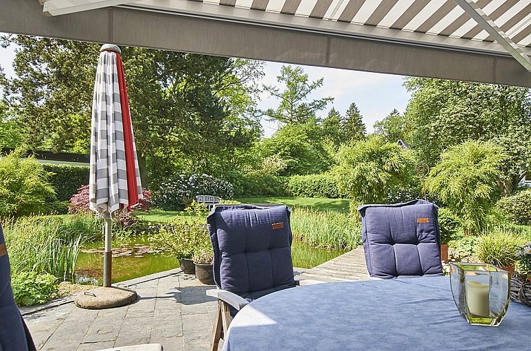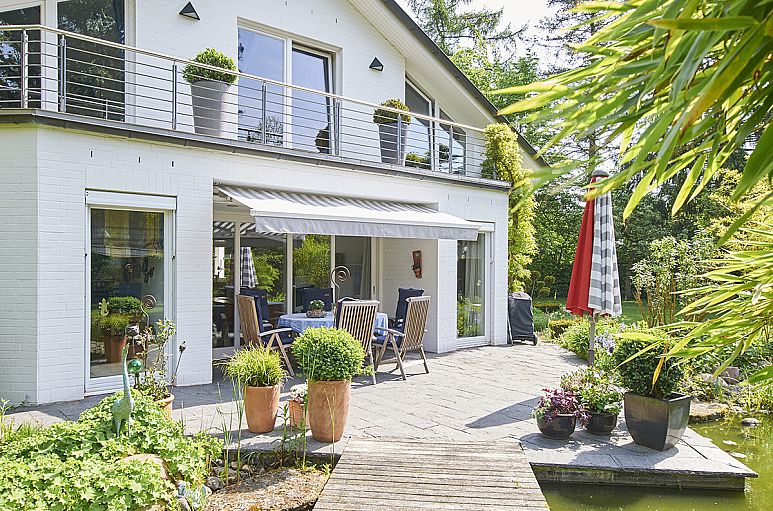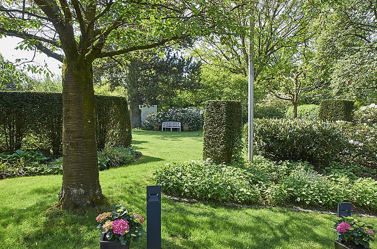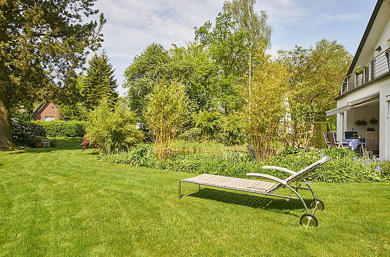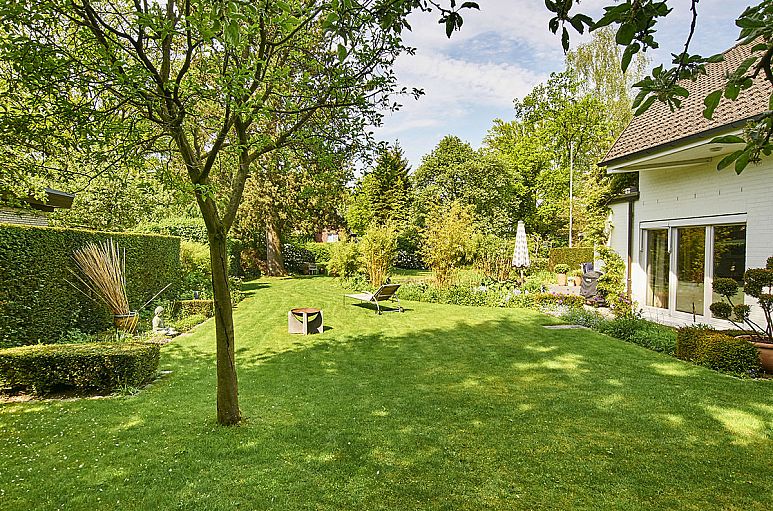 Das außerordentlich breite Grundstück verfügt über eine ideale Süd-West- Ausrichtung und ist durch einen bepflanzten Wall zur wenig befahrenen Straße uneinsehbar abgeschirmt. Die Grundstücksgröße beträgt 1.504 m². Der Garten wurde aufwendig durch einen Gartenarchitekten angelegt und ist liebevoll gepflegt. Die Terrassenanlage ist mit Schieferplatten belegt, Zuwegungen in Granitpflaster.