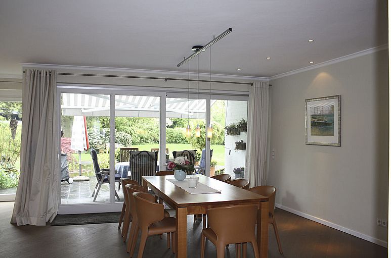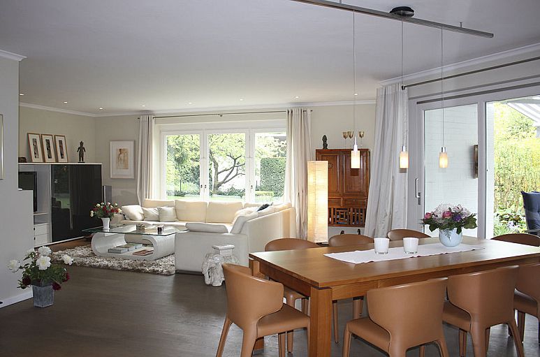Die hochwertige Villa wurde 1994 erbaut und öffnet sich nach Süden und Westen. Der besondere Charakter des Hauses wird durch raumhohe Verglasungen und lichtdurchflutete Räume in Erd- und Obergeschoss nach Süden und Westen geprägt, die einen wunderschönen Blick in den Garten und eine ideale Besonnung gewährleisten.