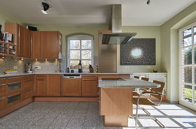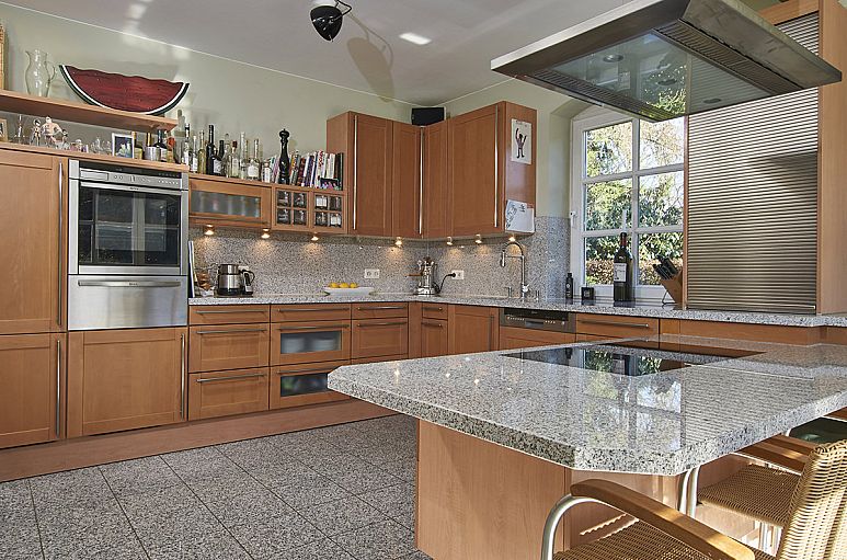 Die Bereiche Wohnen, Essen und Kochen gehen großzügig auf etwa 55 m² ineinander über. Die Küche wurde mit einer Kochinsel und Esstisch konzipiert und verfügt über eine zweiflügelige Schiebetüranlage zum Wohn- / Essbereich. Einbauten von Siematic, Granitarbeitsflächen, Geräte von Neff und Gutmann. Wohnbereich mit klassischem Kamin, umrahmt von hochwertigen Einbauten. Die Deckenhöhen im Erdgeschoss betragen etwa 2,60 m. Dimmbare Deckenspots. Glatte geputzte Wände. Terrassenanlage aus Klinkerstein über die gesamte Hausbreite. Hochwertige Olivenholz Parkettböden im Erdgeschoss. Holz - Treppenanlage. Im Dachgeschoss Parkettböden aus Kirschholz. Großzügiges Vollbad mit Doppelwaschtisch, Badewanne, gemauerter Dusche und Fussbodenerwärmung.