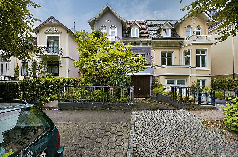 Hier finden Sie noch originale Stuckreliefs, die ursprüngliche Treppenanlage, Eichenparkett und Pitchpine im Erdgeschoss, Pitchpine Böden im I. Obergeschoss. Zahlreiche ursprüngliche Innentüren sind vorhanden. Originale gusseiserne Heizkörper. Die Struktur des Hauses ist erhalten und gestattet ideal die Nutzung als Familien-Villa. Die Deckenhöhen betragen im Erdgeschoss etwa 3,45 m und im I. Obergeschoss etwa 3 m, im Kellergeschoss etwa 2,50 m.