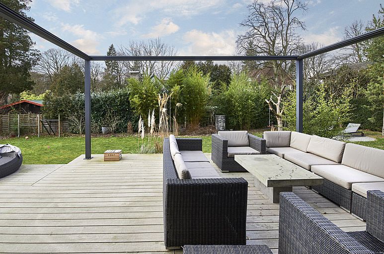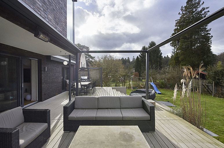 Das etwa 32 m breite Grundstück verfügt über eine Größe von 1.380 m². West-Grundstück mit viel Sonne von Süden und Westen im hinteren Gartenbereich. Elektrische Toranlage mit gepflastertem Vorplatz und breitem Doppelcarport sowie Zufahrt zur Tiefgarage für 2 PKW. Alte Buchenhecken. Etwa 80 m² große Terrassenanlage aus hochwertigen, pflegeleichten Poly-Holzdielen.