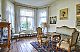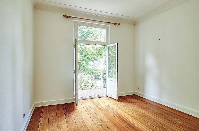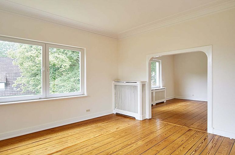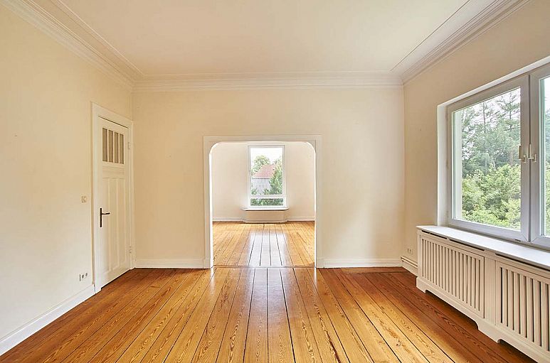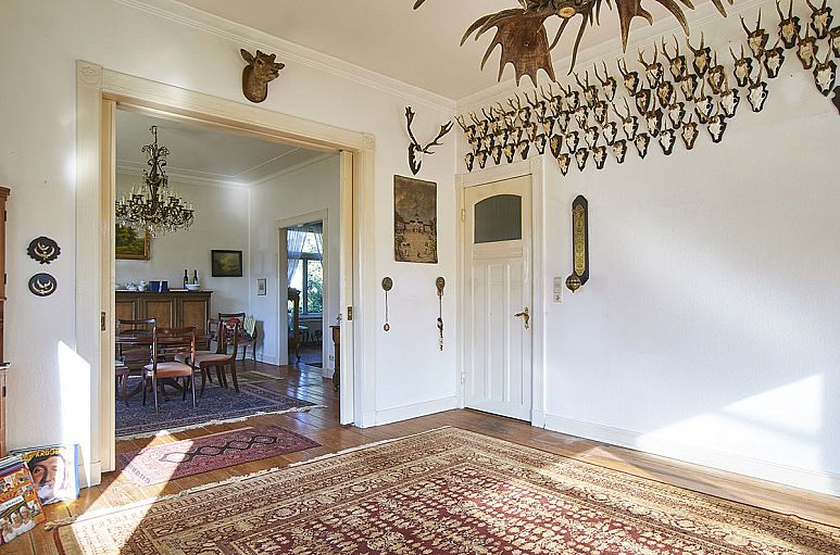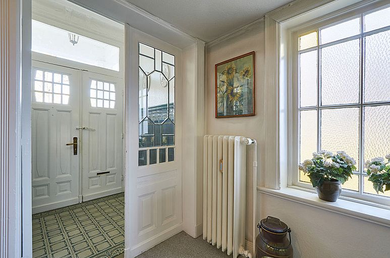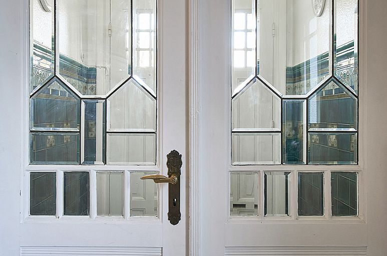 Klassische Raumaufteilung mit ineinander übergehendem Wohn- / Essbereich, Schiebetüren. Eine ganz besondere Atmosphäre schaffen die originalen Stuckdecken, die Diele mit aufwendig gearbeiteter Holz-Treppenanlage, die Mosaikfenster sowie Pitchpine-Dielen in Erd- und Obergeschoss. Das Entrée verfügt über eine zweiflügelige Haustür, Verbindungstür im Windfang mit facettengeschliffenen Glaseinsätzen, wunderschönen, alten Zementfliesen und farbigen Wandfliesen. Zahlreiche originale Innentüren sind vorhanden. Stilvolle alte, gusseiserne Heizkörper, teilweise mit angefertigten Holzverkleidungen. Die Deckenhöhen betragen im Erdgeschoss etwa 3,20 m und im Obergeschoss etwa 3 m.