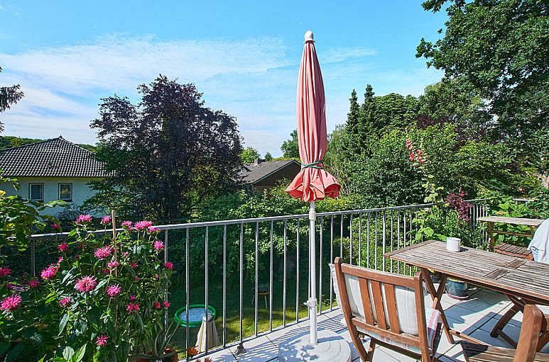 Die Wohnung verfügt über eine sehr gelungene Raumaufteilung mit großzügigem Wohn- / Essbereich und guter Belichtung, breiter Diele und zwei sehr reellen Zimmern (etwa 31,5 m² + 19,5 m²). Wohn- / Essbereich und breite Diele mit hellen Parkettböden. Vom Wohn-/ Essbereich und Zimmer I Ausgang auf den sonnigen Süd-Balkon mit reizvollem Blick über angrenzende Gärten. Küche mit weißen Einbauten und E-Geräten. Weißes Vollbad mit Dusche, WC und Doppelwaschtisch. Weiße Objekte mit Chrom-Armaturen. Gäste-WC im gleichen Stil. Großer Spitzboden für Abstellzwecke über der gesamten Wohnung. Der Zugang erfolgt von der breiten Diele über eine Einschubtreppe.
