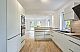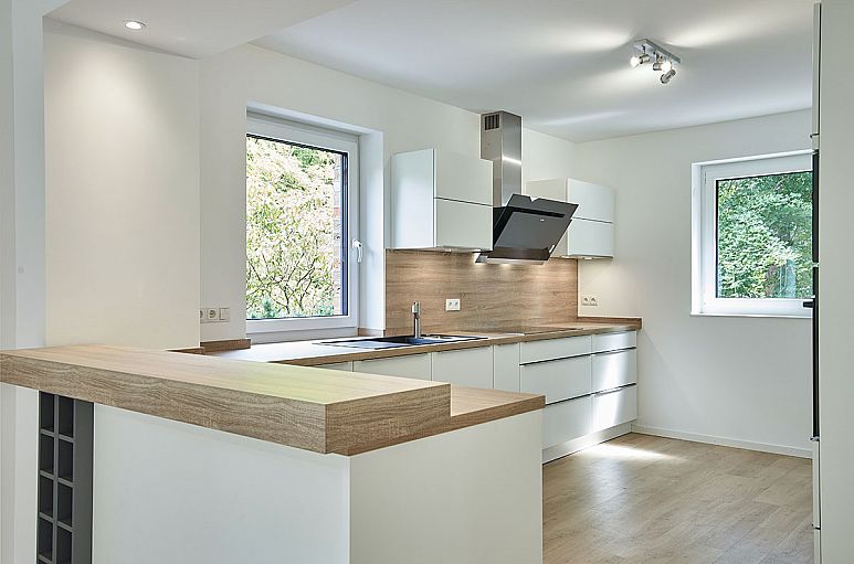 Hochwertige Nolte Einbauküche mit matt-weißen Fronten und Edelstahl-Griffleisten, Esstresen, Apothekerschrank. Küchenschränke mit Einschüben. Arbeitsflächen und Küchenschild in hellem Holzfarbton. Elektrogeräte von Bosch, breites Induktionskochfeld, Design-Umlufthaube sowie größeres Spülbecken. Vollintgrierte Geschirrspülmaschine, Backofen sowie Dampfgarer, Kühl-/ Gefrierschrank (Hyperfresh - Funktion).