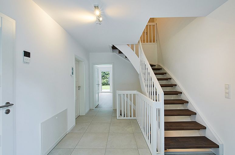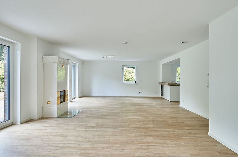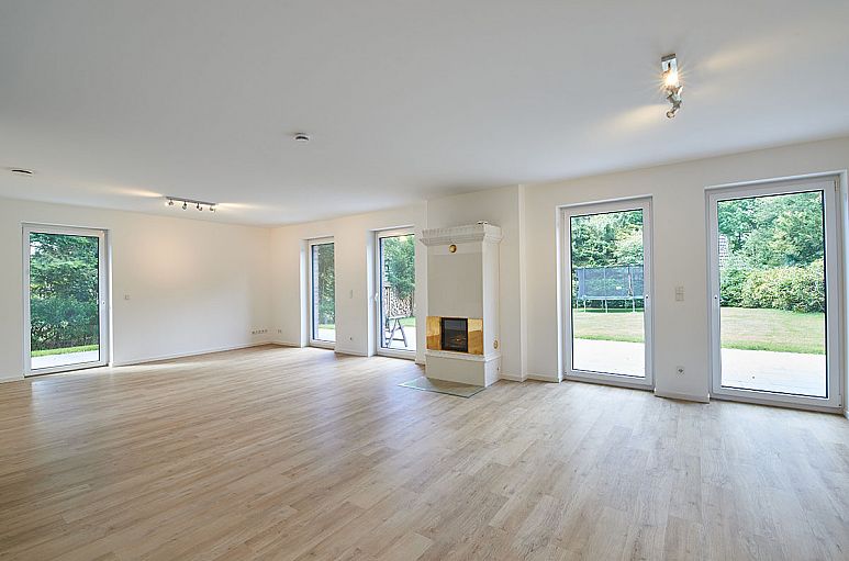 Alle Wohnräume des Hauses sind mit Fußbodenheizung sowie Netzwerkdosen ausgestattet. Zahlreiche LED-Designleuchten in Edelstahl. Besonders reizvolle, weiße Holz-Treppenanlage mit offenen Wangen und Lichteinfall durch die Glasumrahmungen der Eingangstür. Die Fußböden sind mit Designbelägen in hellen, gekälkten Holzfarbtönen und Feinsteinzeug in einem Sandsteinfarbton ausgestattet. Weiße Innentüren mit Kassetten. Großzügiger, gut belichteter Wohn- / Essbereich und Wohnküche, auf etwa 65,5 m² offen ineinander übergehend. Von hier genießt man einen herrlichem Ausblick über das Grundstück. Ein besonderer Eyecatcher ist der klassische Kaminofen mit weißen Kacheln und Messingtüren. Die Terrassenanlage über die gesamte Hausbreite ist in Naturstein gearbeitet und nach Süden seitlich um das Haus herumgezogen.