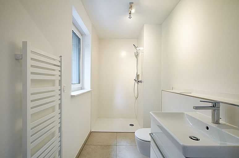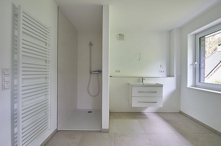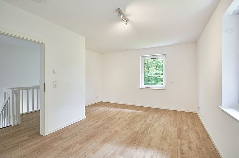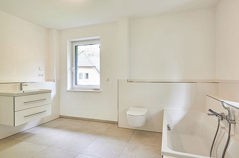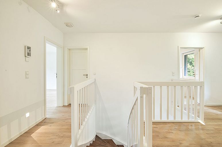 Obergeschoss (ohne Dachschrägen) mit reizvoller Empore und drei sehr reellen Zimmer mit guter Belichtung, Abstellraum sowie Fußböden mit Designbelägen in hellen, gekälkten Holzfarbtönen. Großzügiges Vollbad mit großformatigen, weißen Fliesen und Böden mit Feinsteinzeug in Sandsteinfarbton. Moderne, weiße Objekte mit Chrom–Armaturen, Waschtisch mit Unterschrank sowie Dusche mit gemauerter Duschabtrennung und extraflacher Duschwanne, Handtuchtrockner. Gäste-WC mit Dusche und Waschtisch im gleichen Stil.