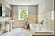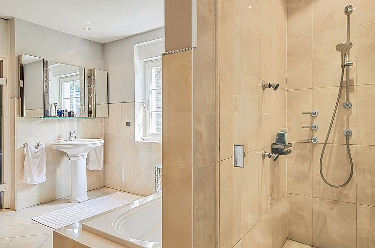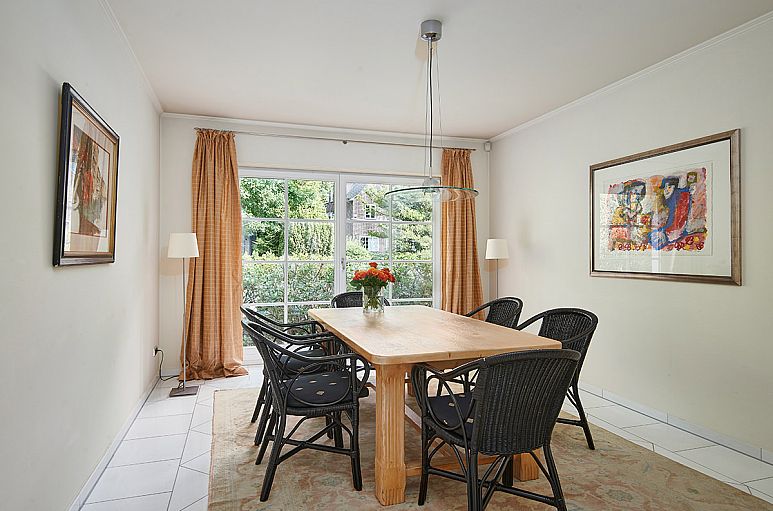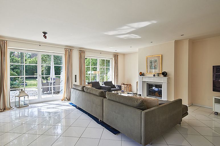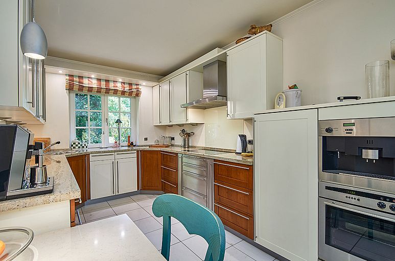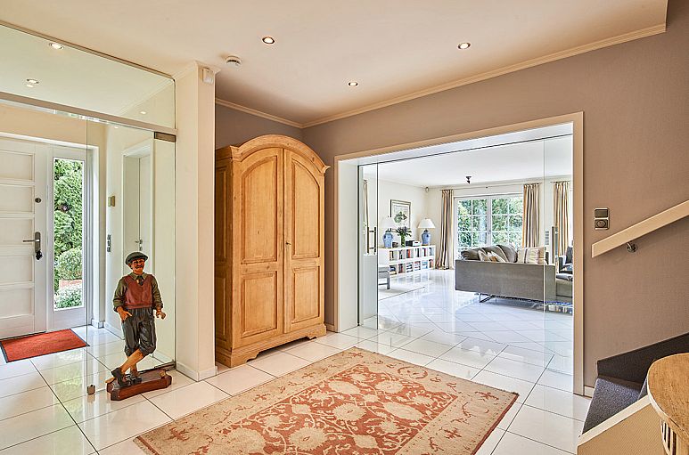 Weiße Holzfenster und Türen mit Sprossenaufteilung, abschließbare Fensteroliven. Elektrische, programmierbare Außenrollläden in Erd- und Obergeschoss, zentral oder einzeln schaltbar. Erdgeschoss mit Deckenhöhen von bis zu etwa 2,60 m, helle Natursteinböden, Fußbodenheizung. Abgehängte Decken mit schwenk- und dimmbaren Einbauspots. Elektroschalter-Programm von Busch + Jäger. Großzügiger, sehr heller Wohn-/ Essbereich mit drei breiten, zweiflügeligen Türelementen, Marmorkamin mit einer Glasscheibe verschließbar. Terrassenanlage über die gesamte Hausbreite mit Natursteinbelag und Süd-Ausrichtung. Hochwertige Einbauküche mit Granit-Arbeitsfläche von Goldreif, E-Geräten mit Edelstahlfronten von Siemens und integrierter Espresso-Maschine von Miele. Edelstahl-Abzugshaube. Ein separates Zimmer, z.Zt. Esszimmer, im Erdgeschoss.