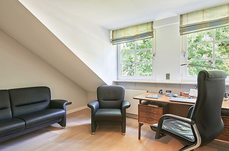 Dachgeschoss mit hellen Eichenholz-Dielenböden. Großzügiger Schlafbereich (Zimmer II) mit breitem, begehbarem Kleiderschrank und Netzfreischalter. Von hier Ausgang auf den Süd - Balkon, Kupferverkleidungen, Geländer mit Edelstahl und Glas sowie neuen Banqkirai-Dielen. Ein weiteres, großzügiges Zimmer Dachgeschoss. Vollbad mit hellen Fliesen, Fußbodenheizung und hochwertiger Ausstattung. Dornbracht Unterputzarmaturen, weißen Objekten von Villeroy & Boch und Keramag, Körperform-Badewanne, Waschtisch, WC, Bidet und Urinal. Geräumige Dusche mit Glastür, Körperbrausen und Kneipp Schlauch. Eingebaute Klafs Sauna / Sanarium.
