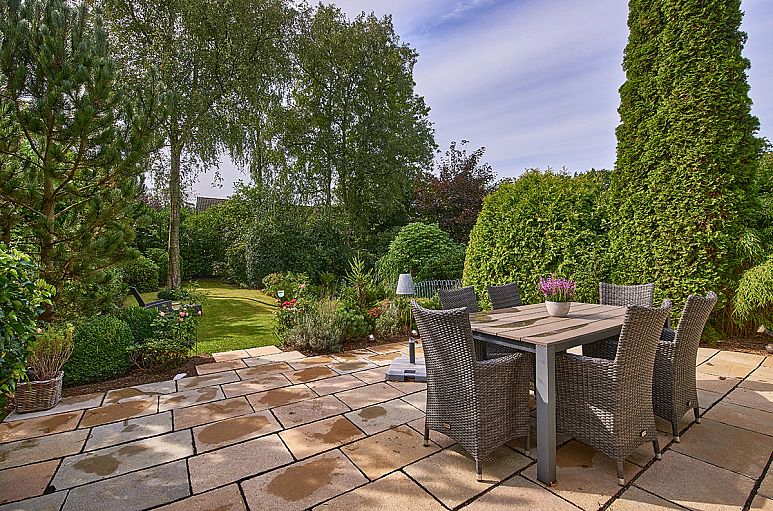 Die zum Verkauf stehende Doppelhaushälfte verfügt über ein Grundstück von etwa 580 m², Teilung gemäß WEG. Zuwegung und Vorplatz mit offenem Stellplatz für zwei PKW mit Granit-Pflasterung. Die Genehmigung für die Errichtung einer Garage liegt vor. Reizvolle Naturstein-Terrassenanlage (etwa 36 m²) mit sonniger Süd-Ausrichtung. Liebevoll angelegter Garten mit Rasenfläche, zahlreichen immergrünen Abpflanzungen, Rhododendren und Buchsbäumen.