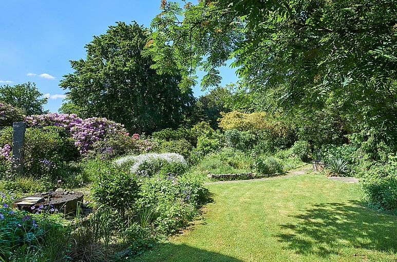 Das reizvolle Grundstück verfügt über eine Größe von etwa 1.100 m². Viel Sonne von Osten, Süden und Westen. Der großzügige Garten ist mit zahlreichen immergrünen Abpflanzungen, Rasenfläche, Hecken und Bäumen angelegt. Großzügige, sehr geschützte Terrassenanlage im Winkel des Hauses, teilweise überdacht. Ein charmantes Wasserspiel mit asiatischer Anmutung, in Form einer mit Wasser überflossenen Natursteinmauer und seitlichen Granit-Stehlen rahmt die Terrassenanlage ein. Im hinteren Garten ein weiterer, überdachter Sitzplatz mit viel Sonne über den ganzen Tag. Ein angelegter Gartenteich mit einem kleinen Wasserfall.