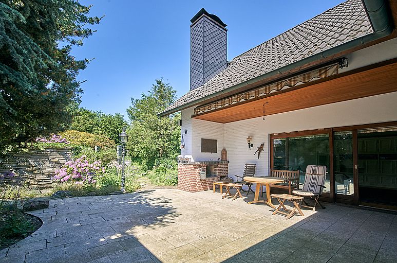 Großzügiger Wohn- und Essbereich auf versetzten Ebenen mit Ausgang auf eine sehr geschützte, im Winkel des Hauses angelegte Terrassenanlage mit Aussenkamin. Diese ist teilweise überdacht, so dass man Sie auch an kühleren Tagen und bei Regen ideal nutzen kann. Ein herrlicher Platz ist der Wohnbereich mit Deckenhöhen von bis zu 2,75 m und viel Licht durch die großen Fensterflächen und die breite Schiebetüranlage. Von hier genießt man den Ausblick in den Garten. Parkettfußboden, Kamin. Hauptschlafbereich im Erdgeschoss mit Zimmer I und Bad en Suite mit heller Ausstattung, weißen Objekten, Whirlpool-Wanne, Dusche, Handtuchtrockner. Gäste-WC im gleichen Stil. Küche mit hellen Einbauten und E-Geräten mit Edelstahlfronten. Abstell- / Vorratsraum. Im Dachgeschoss befinden sich drei sehr reelle Zimmer, Flur und ein weißes Duschbad. Zimmer II mit Ausgang auf eine geschützt gelegene Loggia mit reizvollem Blick über angrenzende Gärten.