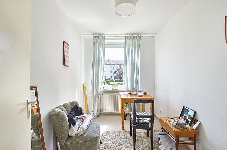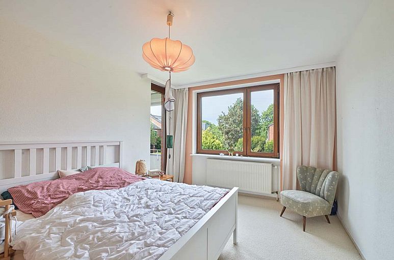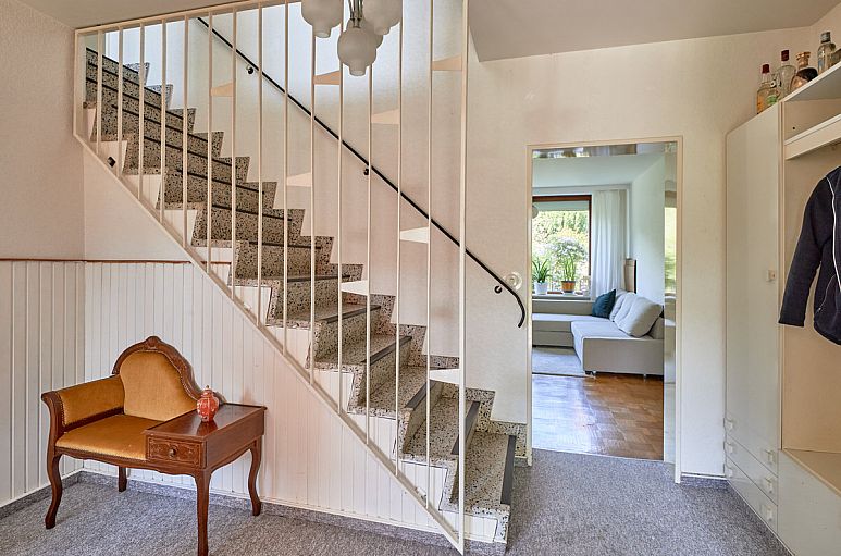Eingangsdiele mit Gäste-WC. Großzügiger Wohn- / Essbereich über die gesamte Hausbreite mit Parkettboden und Blick in den Garten. West-Terrasse, teilweise überdacht. Alle Fenster der Frontfassade etwa 2005 erneuert, Holzfenster mit Isolierverglasung auf der Rückseite, hochwertige Haustür 2015 erneuert. Obergeschoss ohne Dachschrägen. Hier befinden sich 4 Zimmer, zwei davon mit Ausgang auf den Balkon. Bad mit weissen Fliesen und Glasdusche, 2011 erneuert. Die beiden kleineren Zimmer können zu einem größeren zusammengelegt werden. Das Dachgeschoss kann noch ausgebaut werden (Grundfläche etwa 50 m²). Vollkeller mit den üblichen Kellerräumen. Rolläden im gesamten Erdgeschoss sowie am Balkon im Obergeschoss. Kupferregenrinnen wurden rundherum erneuert.