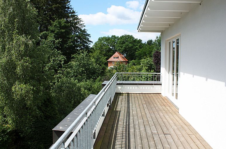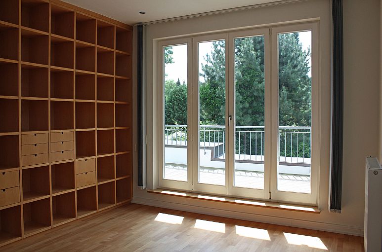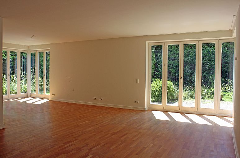 Heller Wohn-/ Essbereich über die gesamte Hausbreite mit schönem Ausblick in den Garten. Von hier Ausgang auf die breite Terrasse mit sehr guter Besonnung von Süden und Westen. Fussbodenheizung, Deckenhöhen von bis zu 2,90 m. Granitböden im Eingangsbereich, Küche und Gäste-WC. Parkettböden im Wohn- / Essbereich und weiteren Räumen. Hochwertige Bulthaup Einbauküche mit E-Geräten von Siemens. In Schlafzimmern, Diele, Hauswirtschafts-, Vorrats und Abstellräumen befinden sich zahlreiche hochwertige Einbauschränke. Im Obergeschoss befinden sich drei großzügige Zimmer mit jeweils etwa 22 m², ein Bad und ein großer HW-Raum. Im Staffelgeschoss ohne Schrägen befinden sich zwei weitere Zimmer und ein Bad, ein Abstell/-Technikraum sowie die sehr reizvolle Dachterrasse mit Süd-West Sonne.