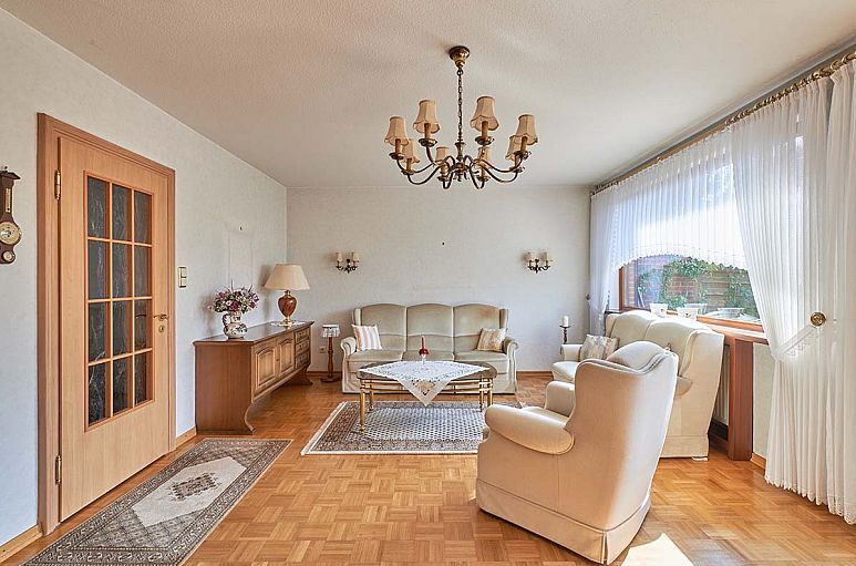 Eingangsdiele mit Garderobe. Großzügiger Wohn- / Essbereich über die gesamte Hausbreite mit Parkettboden und Blick in den Süd-Garten. Sonnige breite Terrasse. Hochwertige Holzfenster mit Isolierverglasung sowie Haustür der Fa. Lantz. Obergeschoss ohne Dachschrägen. Hier befinden sich 3 Zimmer, eines davon mit Ausgang auf den Süd-Balkon. Zwei Bäder und ein weiteres Gäste-WC. Vollkeller mit den üblichen Kellerräumen. Elektrische Rolläden auf der gesamten Südseite teilweise auch an der Frontseite des Gebäudes. Kupferregenrinnen wurden rundherum erneuert.