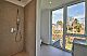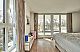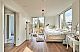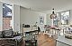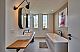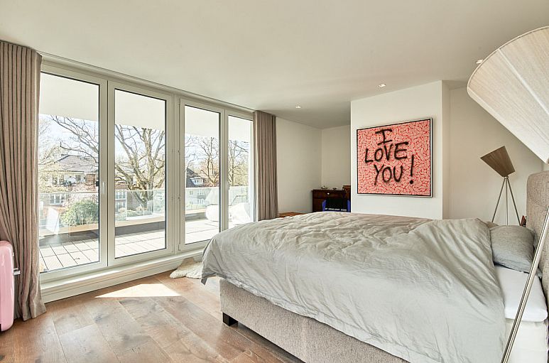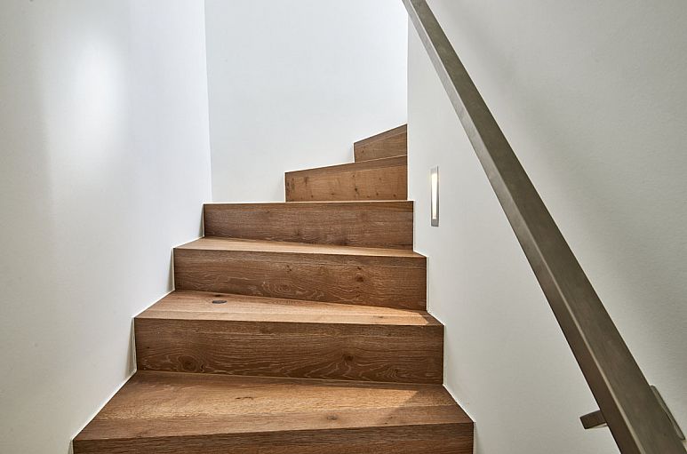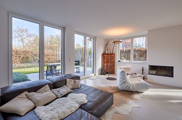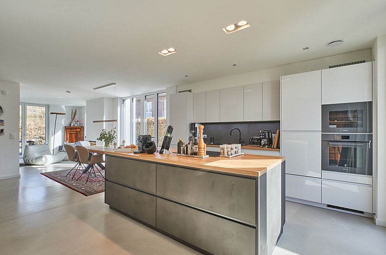 Das Erdgeschoss verfügt über einen hellgrauen vor Ort gefertigten Pandomo Beton – Fußboden. Hier finden Sie Entrée, Gäste – WC und offen ineinander übergehend die Bereiche Kochen, Essen und Wohnen. Breiter verglaster Eckkamin. Kücheneinbauten mit freistehendem Kochblock, Weinkühlschrank und Quooker. Die breite Terrasse mit Mauer zum Nachbarn erweitert den Wohnbereich. Sehr schön gearbeitete Treppenanlage mit indirekter Beleuchtung, die Stufen sind mit Holz belegt.