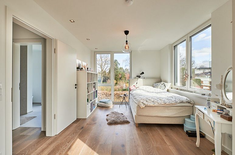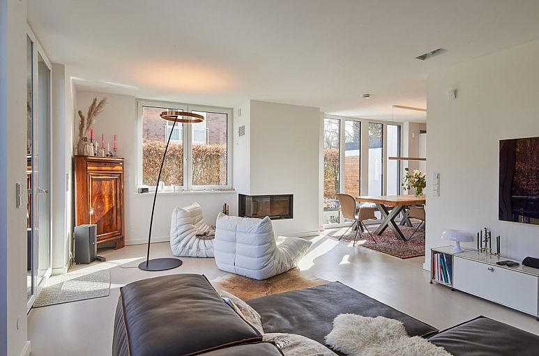 Das hochwertige Haus wurde 2020 erbaut und befindet sich in einem sehr gepflegten Zustand. Der besondere Charakter wird durch die lichtdurchfluteten Räume und das Zusammenspiel der modernen Architektur mit der hochwertigen Innengestaltung geprägt. Das harmonische Farbkonzept mit Weiß (Wände, Fenster, Türen und Küchenmöbel), Betonfarbtönen (Erdgeschossfußboden, Küchenblock, Fliesen der Bäder) und Holz (Dielenfußböden Zimmer im Keller, Ober- und Staffelgeschoss, Treppenanlagen, Dachterrasse) schafft eine sehr behagliche Atmosphäre.