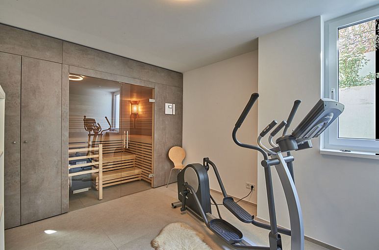 Der Keller mit Wohnraumhöhe bietet einen ausgebauten Raum mit Fenster, Sauna- / Fitnessraum mit Fenster, Duschbad mit Fenster, zwei Abstell- und einen Technikraum. Vor den beiden ausgebauten Räumen ein abgeböschter Bereich.