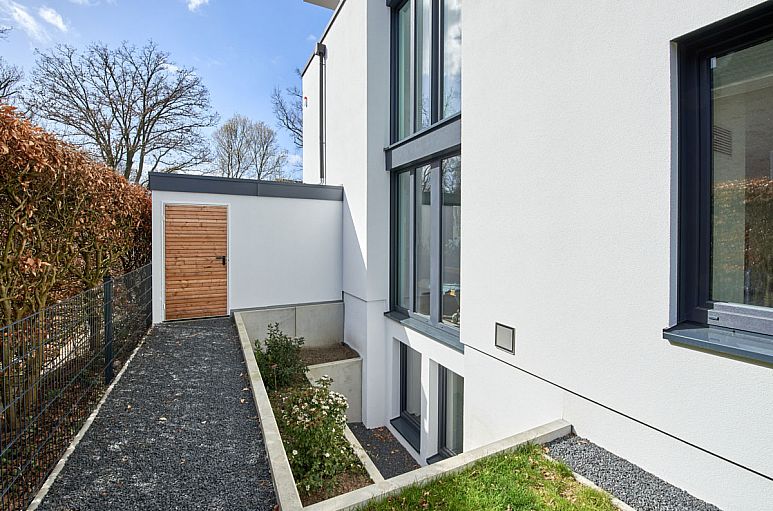 Anthrazitfarbene Fenster und Türen mit Dreifach – Verglasung, von innen weiß. Haustür, Dachabschlüsse und Carport im identischen Farbton. Be- und Entlüftungsanlage mit witterungsabhängiger Steuerung und Wärmerückgewinnung. Außenbeschattungen. Alarmsystem mit Außenhautsicherung und Aufschaltung auf eine Wachzentrale. Zahlreiche Einbauleuchten im gesamten Haus.