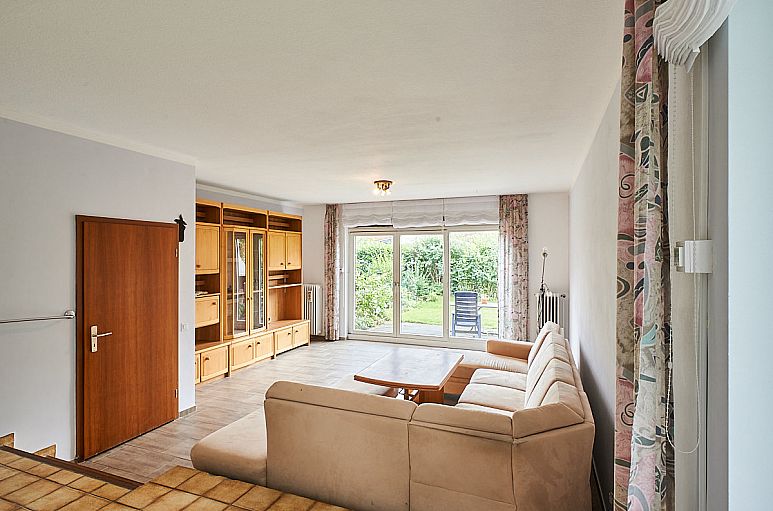 Großzügiger Wohn- und Essbereich auf versetzten Ebenen mit Ausgang auf eine sehr geschützt gelegene Terrasse im Winkel des Hauses. Von hier genießt man den Ausblick in den Garten. Fenster überwiegend mit elektrisch betriebenen Außenrollläden. Küche mit hellen Einbauten, E-Geräten und Edelstahlgriffen. Terrasse mit sonniger Süd-West-Ausrichtung und breiter Markise. Gesamtes Obergeschoss ohne Dachschrägen. Hier befinden sich zwei reelle Zimmer, ein halbes Zimmer, Duschbad und Flur. Das Duschbad wurde 2020 neu ausgestattet. Großformatige, weiße Fliesen, Chrom-Armaturen, Rainshower, Glasabtrennung, Waschtisch. Vollkeller mit Hobbyraum, Abstell- und Heizungsraum. Sonnige Terrasse. Heizung von 2011. Einzelgarage seitlich neben dem Haus.