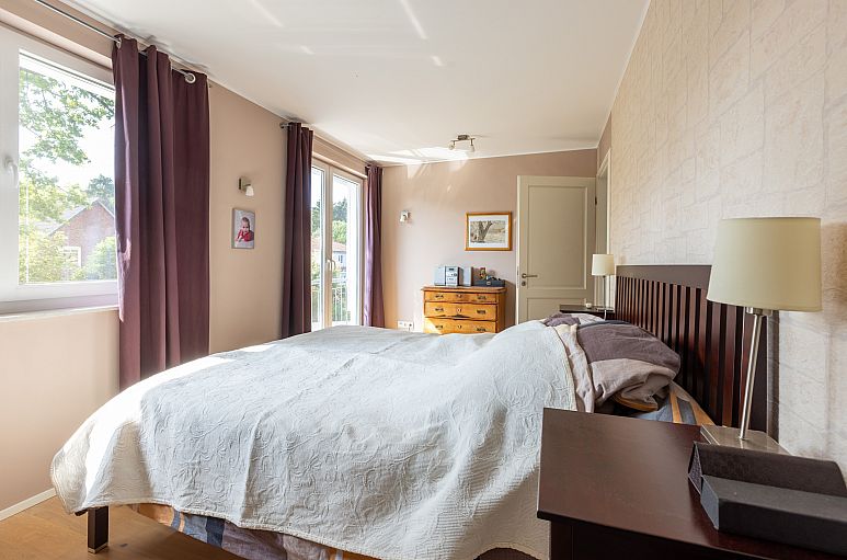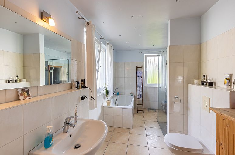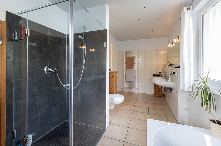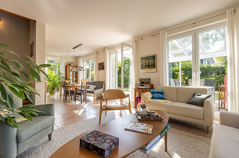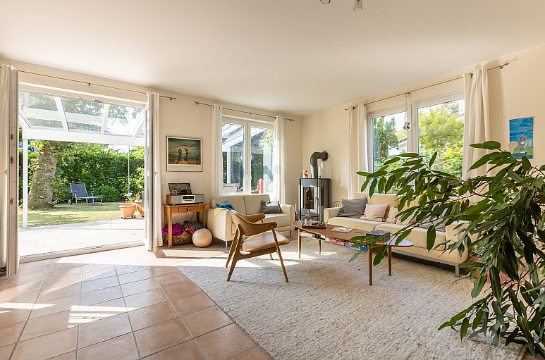 Sehr heller Wohn- / Essbereich mit Kaminofen, seitlich angrenzend die offene Küche mit Kochtresen. Separates Arbeits- / Gästezimmer, Gäste - WC mit Dusche und HW-Raum. Im Erdgeschoss geschmackvolle Fliesenböden mit Fußbodenheizung. Im Obergeschoss komplett ohne Schrägen befinden sich 3 Schlafzimmer und ein sehr großzügiges Vollbad mit Fußbodenerwärmung und angrenzender Sauna. Im Jahre 2016 wurde in allen Schlafzimmern und dem Flur ein hochwertiger Eichendielenfußboden verlegt. Breite Süd-Terrassenanlage vor dem Wohn- / Essbereich, 2018 wurde eine Glas-Terrassenüberdachung erstellt.