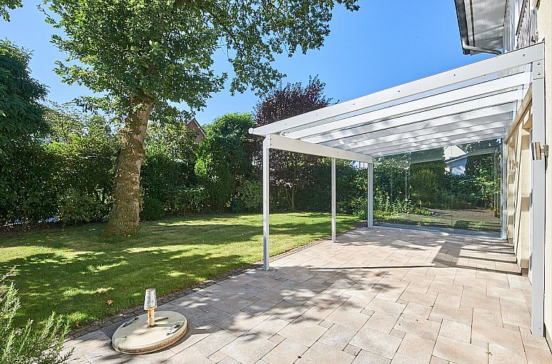 Das Grundstück verfügt über eine Größe von 514 m² und ist mit zahlreichen Abpflanzungen und Rasenflächen pflegeleicht angelegt. Gepflasterte Zufahrt und Zuwegung. Breite, teilweise überdachte Terrassenanlage.