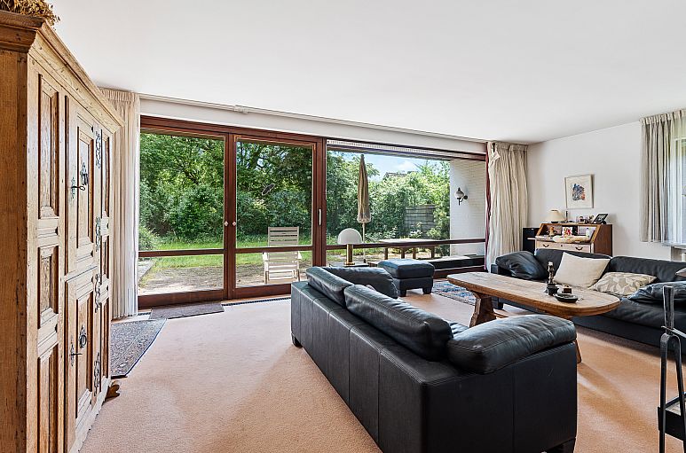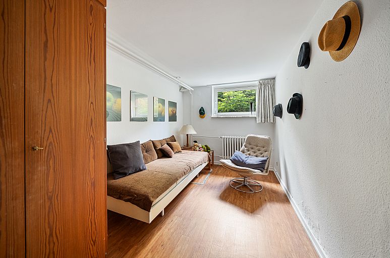 Helles Entrée mit breiter Verglasung. Hohe Eingangshalle mit Empore und offener Treppenanlage aus Holz und Stahl als zentrales Element im Erdgeschoss. Die Halle verfügt über Tageslicht durch zahlreiche Oberlichter in den Dachschrägen. Die Raumhöhe beträgt im Erdgeschoss ca. 2,60 m. Hartholzfenster im Erdgeschoss. Der großzügige Wohn- / Essbereich über die gesamte Hausbreite öffnet sich mit Verglasungen zum Garten. Hier befindet sich ein schlichter Kamin und eine breite, zweiflügelige Tür als Ausgang auf die Terrasse in Südausrichtung, teilweise überdacht. Ein herrlicher Ausblick ins Grüne! Separater Schlafbereich im Erdgeschoss mit zwei Zimmern und Bad, zusätzlich ein weiteres Zimmer vorhanden. Küche mit zeitgenössischen Einbauten. Es ist gut denkbar, die Küche zum Essbereich zu öffnen und zu einer größeren Wohnküche umzugestalten. Dachgeschoss mit Empore. Hier befindet sich ein außerordentlich großes Zimmer IV etwa 37 m² (teilbar), ein weiteres Zimmer, ein kleines Zimmer, ein WC sowie Abstellboden. Im Vollkeller befinden sich zwei ausgebaute und beheizbare Räume (etwa 31 m² + 11 m²) mit Tageslicht. Sauna, Abstell-, Vorratsräume, Heizungskeller, Waschküche. Außenzugang. Großzügige, teilweise überdachte Terrassenanlage, sehr geschützt gelegen, mit Südausrichtung und teilweise überdacht. Es besteht umfassender Modernisierungsbedarf.