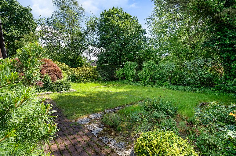 Das sonnige Süd-Grundstück verfügt über eine Breite von etwa 20 m, die Größe beträgt 795 m². Pflegeleichter Garten. Zahlreiche immergrüne Abpflanzungen und Hecken schützen den Garten vor Einblicken. Ein sehr schönes breites und helles Grundstück!