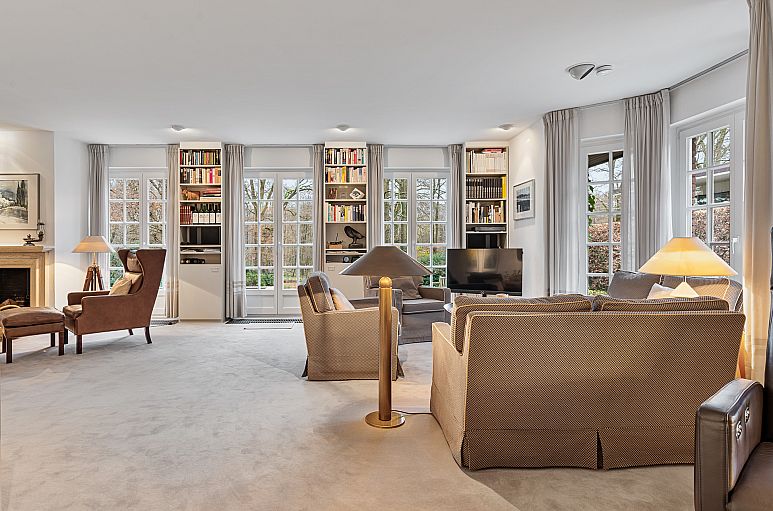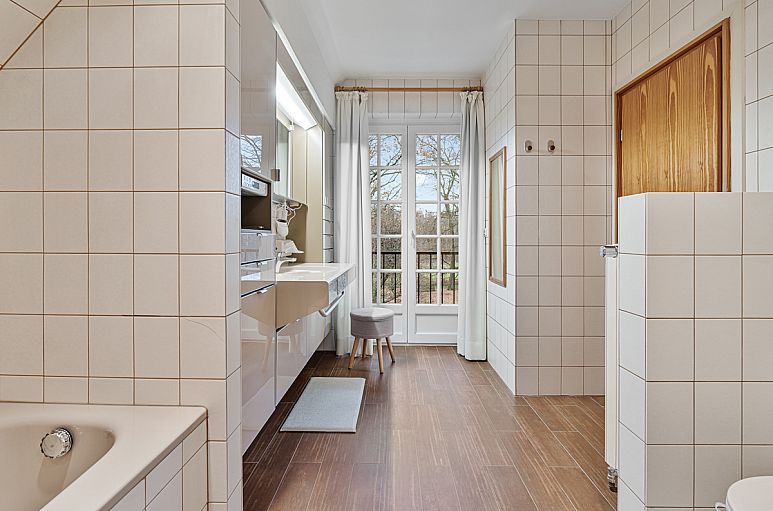 Sehr gelungene Raumaufteilung mit großzügigem Entrée sowie einem großen Wohn- / Essbereich. Im Dachgeschoss befinden sich drei große Schlafzimmer sowie drei Bäder. Die Raumhöhen in Erd- und Dachgeschoß betragen 2,60 m. Der Wohn-/ Essbereich mit Kamin bietet einen herrlichen Blick auf das Grundstück sowie das angrenzende Naturgebiet. Ausgangstüren zur seitlichen und hinteren Terrassenanlage. Die Küche mit weißen Einbauten und Miele / Siemens Geräten wurde 2009 erneuert, Kühlschrank und Backofen wurden 2024 erneuert. Im Dachgeschoss befindet sich ein Elternschlafbereich mit angrenzendem Ankleidezimmer und Vollbad. Darüber hinaus gibt es zwei weitere große Zimmer mit jeweils eigenen Duschbädern (eines davon 2008 erneuert). Fußbodenheizung in Entrée, Küche sowie dem Vollbad, Wohnzimmer mit versenkten Konvektoren. Hochwertige Schrankeinbauten im Wohnbereich sowie im Ankleidezimmer. Granit Terrassenanlage über die gesamte Hausbreite sowie seitlich des Hauses (2008 erneuert) bietet einen wunderschönen Blick über das Grundstück in die Natur. Großer Keller mit üblichen Abstell-, Vorrats- und Heizungsräumen. Die weiß lackierten Meranti - Holzfenster (Fa. Lantz) wurden 2008 erneuert. Die Dacheindeckung wurde 2017 neu beschichtet.