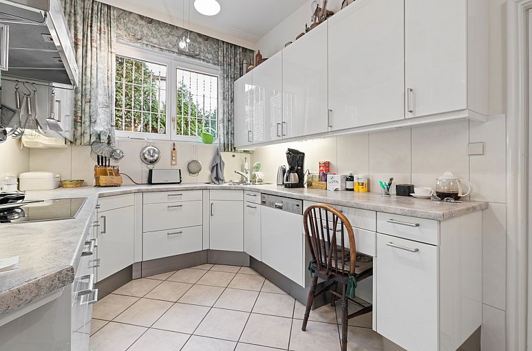 Erdgeschoss mit großem Wohn- / Essbereich mit Ausgang auf die breite Terrassenanlage und schönem Blick in den Garten. Einbauküche, zwei Zimmer, Vollbad und Gäste - WC. Das Obergeschoss bietet insgesamt vier Zimmer ein Bad, separates WC und eine weitere Küche. Zwei sehr schöne Balkone. Im Dachgeschoss zwei weitere Zimmer und ein Bad. Deckenhöhen im Erdgeschoss ca. 3 m. Originale profilierte Holz-Innentüren. Wohn- / Essbereich mit Kamin, dezentem Stuck und Fischgrat-Parkettfussboden. Erneuerte Holzsprossenfenster mit Rolläden im Erdgeschoss, in Ober- und Dachgeschoss ältere Holz- und Kunststofffenster. Granit-Terrassenanlage mit Aussenkamin. Zentralheizungsanlage mit Wärmepumpe und Ölheizung. Hoher Sicherheitsstandard. Insbesondere im Ober- und Dachgeschoss besteht Modernisierungsbedarf.