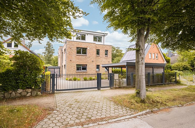 Die Villa wurde 2017 mit zwei Vollgeschossen und Staffelgeschoss erbaut und mit sehr viel Liebe zum Detail von einem Architekten geplant (Erstbezug Januar 2018). KFW 55 Standard. Rotklinkerfassade, weißes Staffelgeschoss mit Dachterrasse, zahlreiche bodentiefe Fenster, 3-fach-verglast, elektrische Außenrollläden, zentral steuerbar. Außen - Wandleuchten. Teilkeller als „weiße Wanne“ ausgeführt mit ausgebautem Raum. Beheizung und Warmwasserbereitung über Erdwärmepumpe mit kontrollierter Be- und Entlüftung.