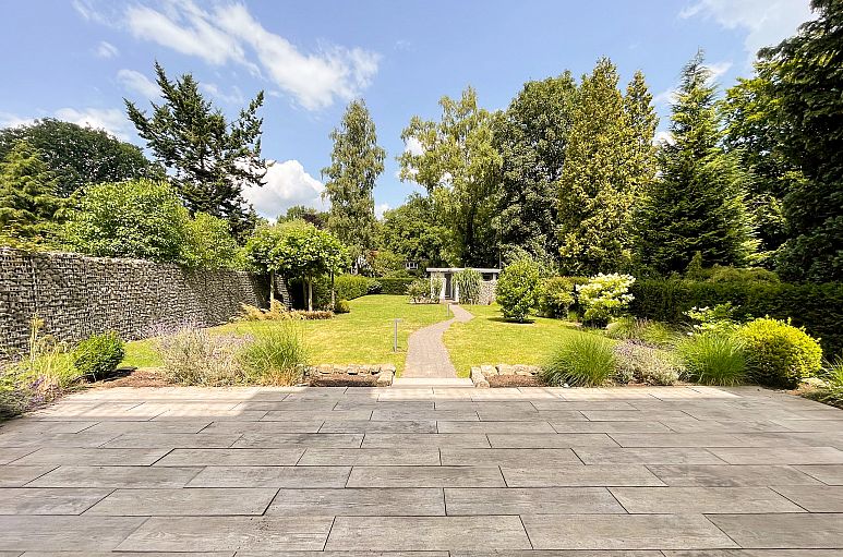 Das Grundstück verfügt über eine Größe von etwa 1.000 m². Der aufwendig und sehr geschützt angelegte, hintere Garten ist von der Straße aus nahezu uneinsehbar. Aufwendig gestaltete Gartenanlage mit mehreren, hohen Steinkorbwänden, zahlreichen immergrünen Abpflanzungen und Rasenfläche. Sehr gute Besonnung bis in den Abend. Terrassenanlage über die gesamte Hausbreite mit großformatigen Platten, eingerahmt von Beeten. Ein Weg führt zum Saunahaus im hinteren Bereich des Gartens. Gepflasterte Zufahrt und Zuwegungen.