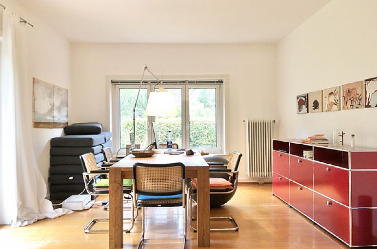 Ein helles Haus mit sehr viel Platz. Insgesamt 10 Zimmer und 3 Bäder. Im Erdgeschoss ein Wohn- / Essbereich mit Ausgang auf die Terrassenanlage, Küche, Bad und zwei weitere Zimmer, die sich mit dem Wohn- / Essbereich und der Küche verbinden oder zusammenlegen lassen. Klassische Pitchpine - Dielenfußböden in Erd- und Obergeschoss sowie teilweise Solnhofener Platten. Deckenhöhen etwa 2,70 m. Im Obergeschoss mit großen Dachgauben befinden sich vier Zimmer und ein Vollbad. Ein Zimmer wurde früher als Küche genutzt. Das Dachgeschoss bietet zwei weitere Zimmer und ein Duschbad. Die Fenster wurden teilweise in Holz oder Kunststoff erneuert. Keller mit Doppelgarage, Heizungsraum sowie den üblichen Vorrats- und Abstellräumen. Es besteht Renovierungsbedarf.