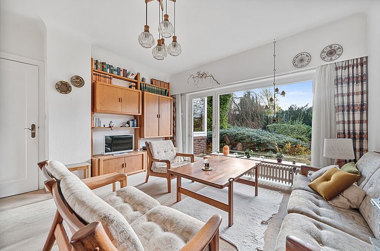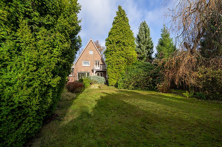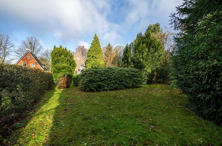 Das sonnige Süd-Grundstück verfügt über eine Größe von etwa 1.095 m². Pflegeleichter, liebevoll angelegter Garten mit Rasenflächen, alten Rhododendren und zahlreichen immergrünen Abpflanzungen.