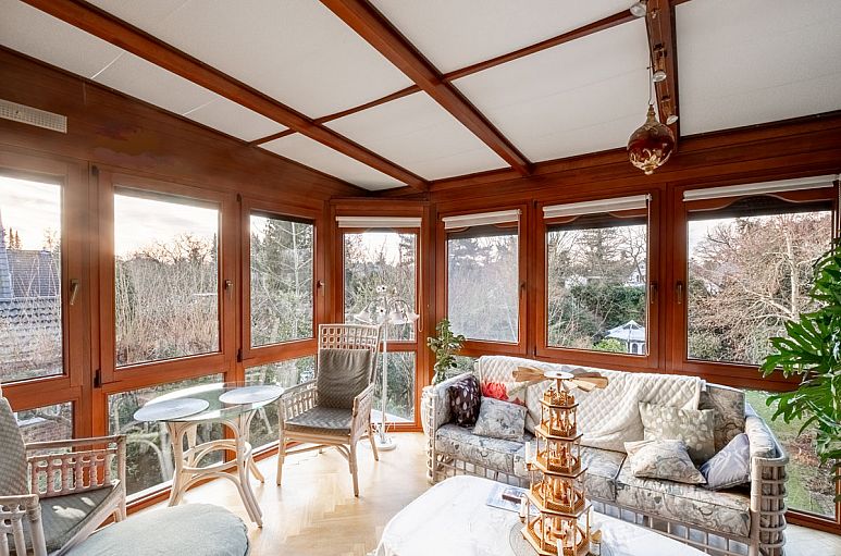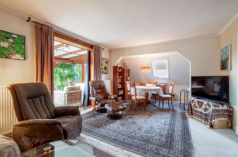 Das Haus ist auch für eine größere Familie mit mehr als zwei Kindern geeignet. Im Erdgeschoss befinden sich neben dem großzügigen Wohn- / Essbereich mit vorgelagertem Wintergarten ein weiteres Zimmer, Küche, Diele und ein Duschbad. Der Wohn- und Essbereich über die gesamte Breite des Hauses geht offen ineinander über und verfügt über alte Pitchpine-Holzdielenböden und einen Kamin. Von hier Ausgang in den Wintergarten mit reizvollem Blick und Ausgang auf die Süd-/ West - Terrasse und in den Garten. Weiße Einbauküche und separate Speisekammer. Duschbad mit bodengleicher Dusche und offener Glasabtrennung. Das Obergeschoss bietet zwei sehr reelle Zimmer, ein kleines Zimmer (derzeit Küche), Bad und Flur mit der Holztreppenanlage zum ausgebauten Spitzboden. Das großzügige Zimmer II ist offen verbunden mit dem reizvollen Wintergarten mit Fischgratparkett. (Eine Aufteilung in zwei großzügige Zimmer ist sehr gut möglich). Von hier genießt man einen herrlichen Blick über die Gärten der Nachbarschaft. Der ausgebaute Spitzboden mit einer Grundfläche von etwa 36 m² bietet zwei derzeit unbeheizte Räume und Flur, die über eine feste Treppe direkt vom Treppenhaus aus erreichbar sind. Vollkeller mit üblichen Kellerräumen, Hauswirtschafts-, Heizungsraum sowie Außenzugang.