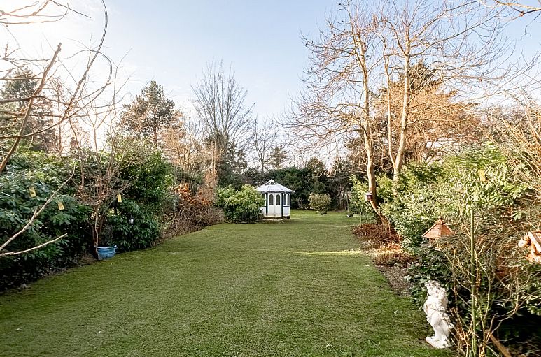 Das sonnige Grundstück verfügt über eine Größe von etwa 999 m². Pflegeleichter, liebevoll angelegter Garten mit großer Rasenfläche, alten Rhododendren und zahlreichen immergrünen Abpflanzungen. Ideale Süd-/ Westausrichtung des Gartens.