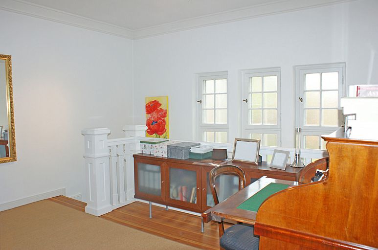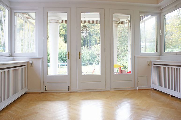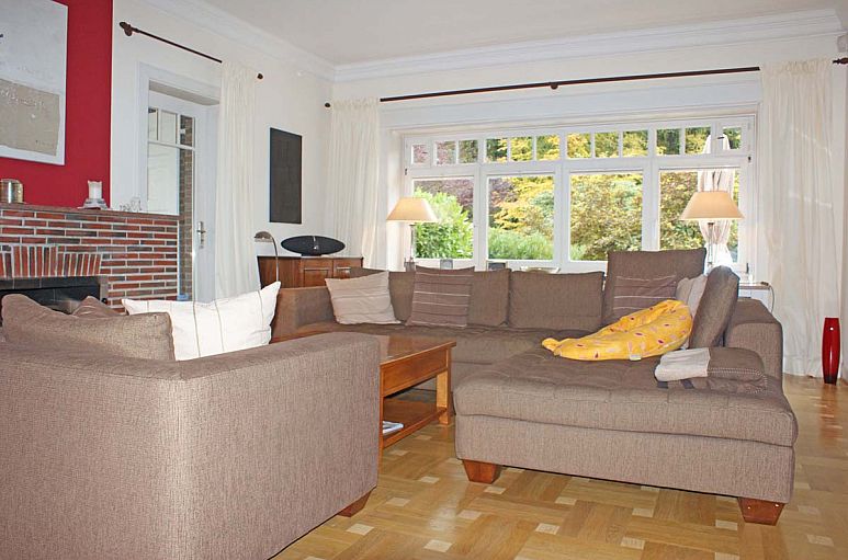 Eingangshalle, hohe Decken, alte Fischgrät-Eichenparkettböden, Kamin, ineinander übergehende Räume, durch Schiebetüren verbunden. Dezenter Stuck, zahlreiche Holz-Einbauten aus dem Baujahr, aufwändige Holztreppenanlage. Der Wohn- / Essbereich besteht aus drei ineinander übergehenden Räumen. Sehr großzügige Terrassenanlage. Im Kellergeschoss befindet sich ein ca. 35 m² großer Bereich mit eigenem Zugang, der für Gäste genutzt wurde.